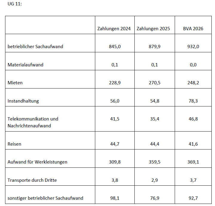 • Der betriebliche Sachaufwand in UG 11 kletterte von 845,0 Millionen Euro im Jahr 2024 auf 879,9 Millionen Euro im Jahr 2025. Das ist ein Plus von 34,9 Millionen Euro.