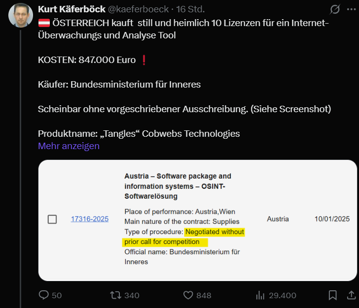 In drei Sätzen: Das österreichische Innenministerium hat Ende 2024 für knapp 900.000 Euro die Überwachungssoftware „Tangles“ der Firma Penlink erworben. Wie ein Eintrag in einer EU-Datenbank nun offenlegt, wird dieses Tool zur Analyse von Aktivitäten im Dark Web und sozialen Medien genutzt. Trotz scharfer Kritik von Datenschützern und Oppositionsparteien verweigern die Sicherheitsbehörden bislang jede detaillierte Auskunft über den genauen Einsatzbereich der Software.