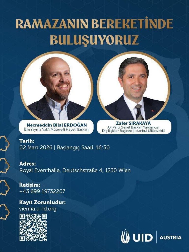 Der Auslöser: Die UID Austria lädt für den 2. März 2026 um 16:30 Uhr in die Royal EventHalle in Wien-Meidling ein. Necmeddin Bilal Erdogan und AKP-Vize Zafer Sırakaya sprechen beim Ramadan-Treffen.