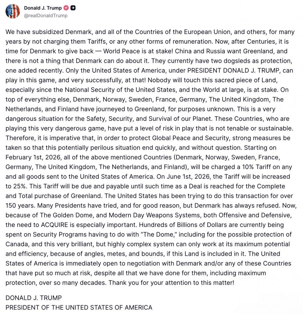 Der Auslöser: Ab dem 1. Februar 2026 erhebt die USA Zölle auf Waren aus Dänemark, Deutschland und weiteren EU-Staaten. Der Grund: Dänemark weigert sich, Grönland zu verkaufen. Ein Gebiet, das laut Trump essenziell für die globale Sicherheit ist.